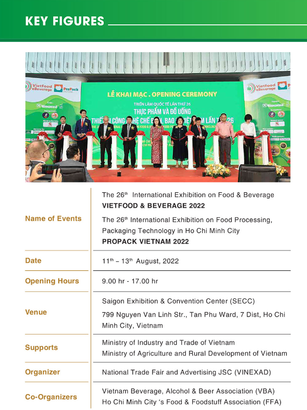 隨著世界各地的行業(yè)和經(jīng)濟(jì)體在新冠疫情之后尋找重建業(yè)務(wù)的機(jī)會(huì),Vietfood將為廣泛的企業(yè)創(chuàng)建貿(mào)易、聯(lián)系和發(fā)展的平臺(tái)。越南食品加工展是當(dāng)?shù)仡I(lǐng)先的貿(mào)易促進(jìn)活動(dòng)。這些展覽由VINEXAD JSC與越南啤酒、葡萄酒和飲料協(xié)會(huì)(VBA)以及胡志明市食品行業(yè)協(xié)會(huì)(FFA)合作舉辦,并得到了越南工業(yè)貿(mào)易部、越南農(nóng)業(yè)和農(nóng)村發(fā)展部以及其他國(guó)內(nèi)外貿(mào)易促進(jìn)組織的支持。
