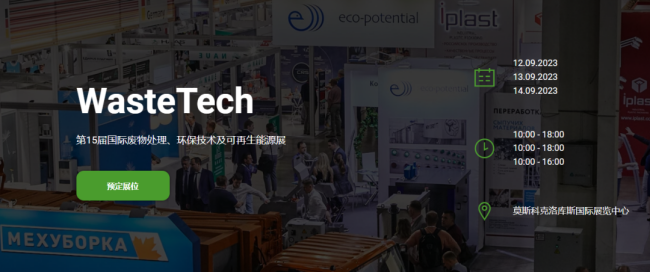 2023年俄羅斯莫斯科環(huán)保展覽會(huì)WasteTech將于9月12日~9月14日在莫斯科克洛庫(kù)斯國(guó)際會(huì)展中心舉辦,舉辦周期兩年一屆。預(yù)計(jì)展會(huì)面積15500平米,專(zhuān)業(yè)觀眾達(dá)到25000人次,參展商數(shù)量及參展品牌超過(guò)400家。