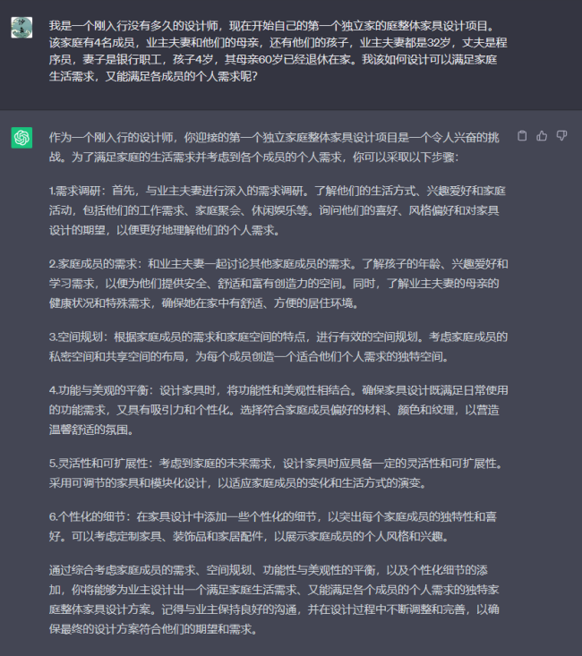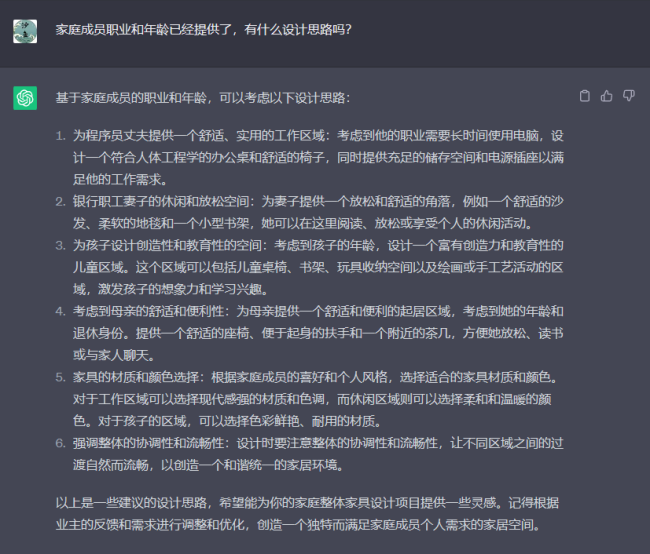 ChatGPT的這些設計思路,可以給我們在家庭整體家具設計提供很多靈感。誠如它最后所說,需要根據(jù)業(yè)主的反饋和需求進行調(diào)整和優(yōu)化,創(chuàng)造一個獨特且滿足家庭成員個人需求的家居空間。