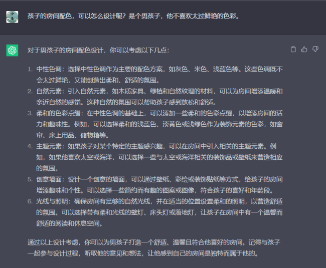 效果驚人,ChatGPT迅速給出了設計要點和建議,還強調(diào)了整體方案的流暢度與協(xié)調(diào)度,在色彩與材質(zhì)的選擇上同樣給出了合理的建議。面面俱到,這很明顯是一個久經(jīng)沙場的老設計師:預留插座、兒童房收納、便于老人起身的扶手設計等都是人性化且有時候會遺漏的地方。
