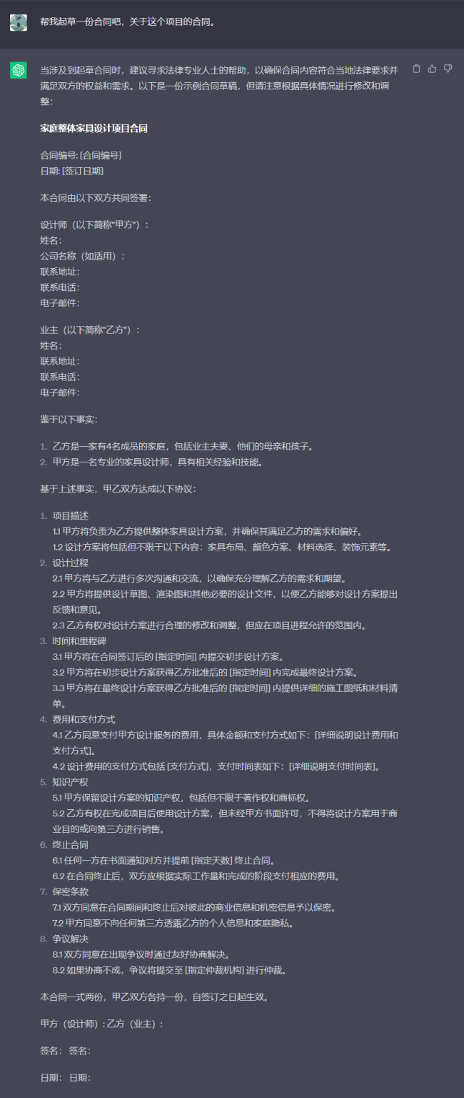 ChatGPT起草的項目合同,可以看到它對項目需求理解的比較清晰