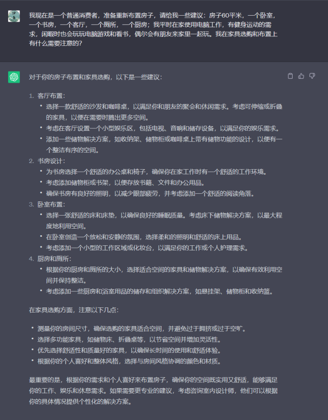作為普通消費者,我們在選購家具或者布置家具的時候,ChatGPT可以給予相當專業(yè)的建議。