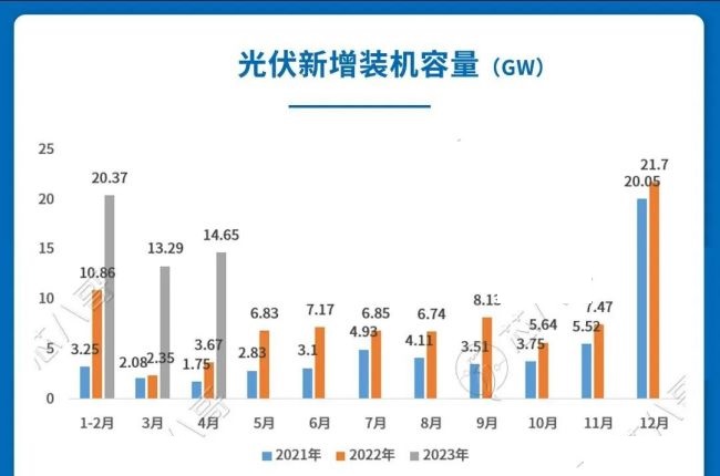 國(guó)家能源局?jǐn)?shù)據(jù)顯示,2023年4月新增光伏裝機(jī)14.65GW,同比增長(zhǎng)299.18%。1-4月光伏新增裝機(jī)48.31GW,較去年同期增長(zhǎng)186.2%。