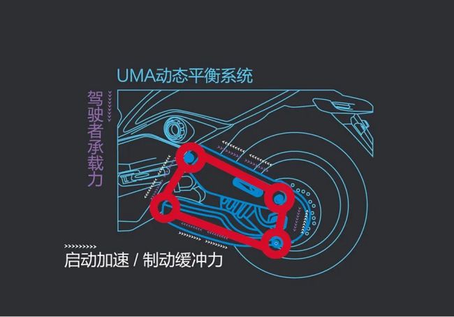 UMA系統(tǒng)采用單邊雙臂多連桿結(jié)構(gòu),車身重心降低,輪轂使用強(qiáng)度更大的鋁合金邊蓋;由傳統(tǒng)三角形三點(diǎn)受力結(jié)構(gòu)升級(jí)為四邊形多點(diǎn)平衡受力結(jié)構(gòu),利用四邊形的動(dòng)態(tài)平衡性原理,將電動(dòng)車運(yùn)行時(shí)受到的阻力與電機(jī)產(chǎn)生的動(dòng)力相互牽制、融合,使整車在行駛時(shí)更具穩(wěn)定性,多點(diǎn)聯(lián)合,舒適到位,動(dòng)感旅程同樣平順自在!